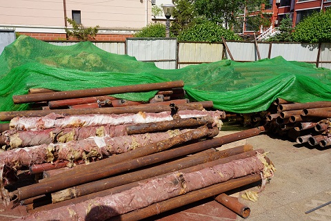 5月17日,筆者來到開天花園小區(qū)的供熱二次管網(wǎng)改造施工現(xiàn)場。在高層單元樓的管道井里,工人正在狹窄的空間里作業(yè),將單元樓道內(nèi)的立管進(jìn)行切割拆除。在施工材料現(xiàn)場,西北角堆滿了拆除下來的地溝管,部分管道腐蝕嚴(yán)重,布滿了密密麻麻的窟窿眼兒;東北角堆放了新到的管材,工人們正在進(jìn)行單元立管外表的打磨工作,打磨完成后再進(jìn)行粉刷兩遍防腐漆。