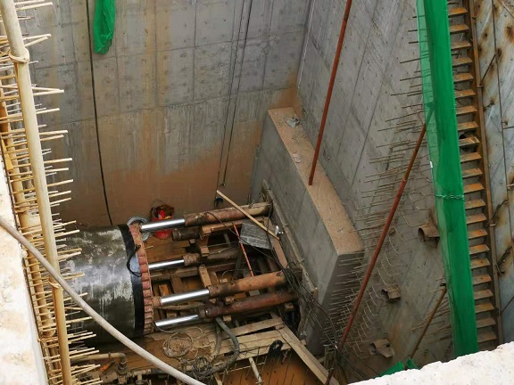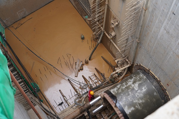 施工現(xiàn)場(chǎng)機(jī)器轟鳴,說(shuō)話需要提高分貝。一進(jìn)入施工現(xiàn)場(chǎng),就看到前方有一個(gè)沉井,沉井20米深、13.4*7.3米間方,這個(gè)沉井是挖掘井,在河的對(duì)岸還有一個(gè)深15.5米的接收井。從沉井圍欄邊看井底,下邊的工作人員都顯得特別的渺小,20米深的井相當(dāng)于6層樓高,恐高的人都不敢往下看。