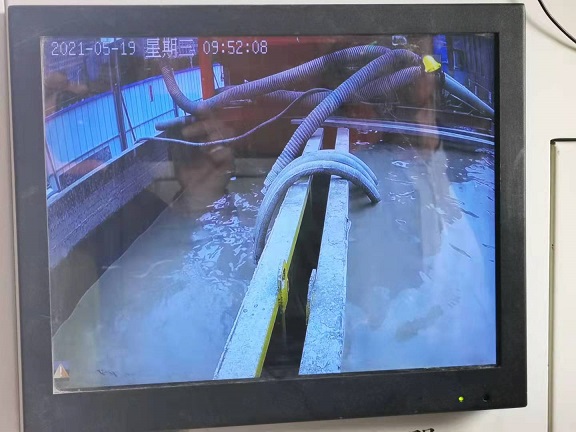 在頂管操作室,可以從電子顯示屏上清晰看到井底施工的畫(huà)面,狹窄的空間里兩名個(gè)人不停的用鐵鍬將設(shè)備挖出的沙土推到水里混合。